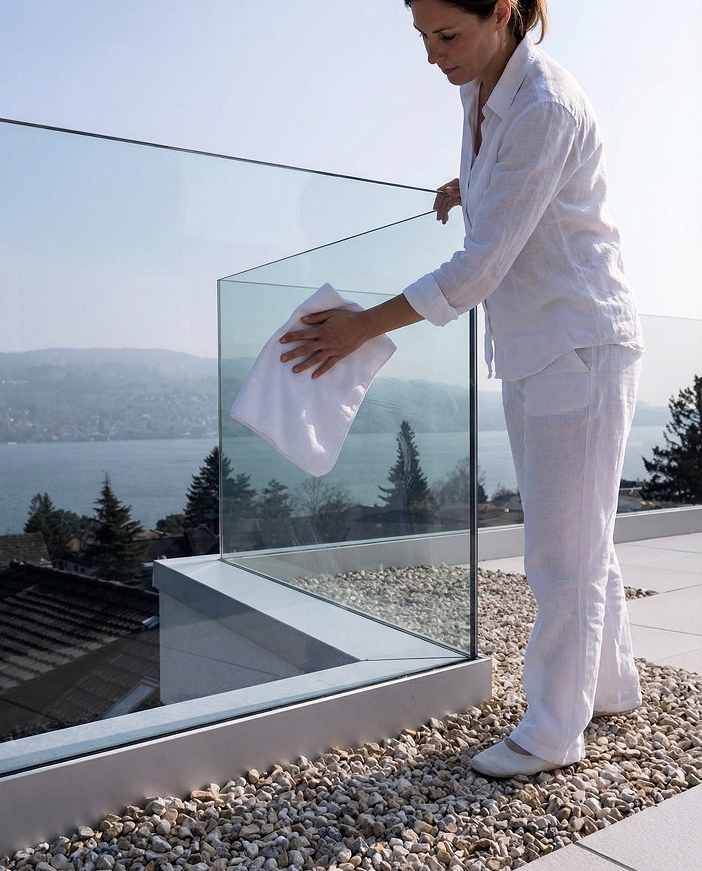 Ограждения «АЛЮТЕХ» не требуют сложного ухода. Стекло легко очищается обычным мыльным раствором. Профили из алюминия не ржавеют и не выцветают, поэтому не нуждаются в подкрашивании.