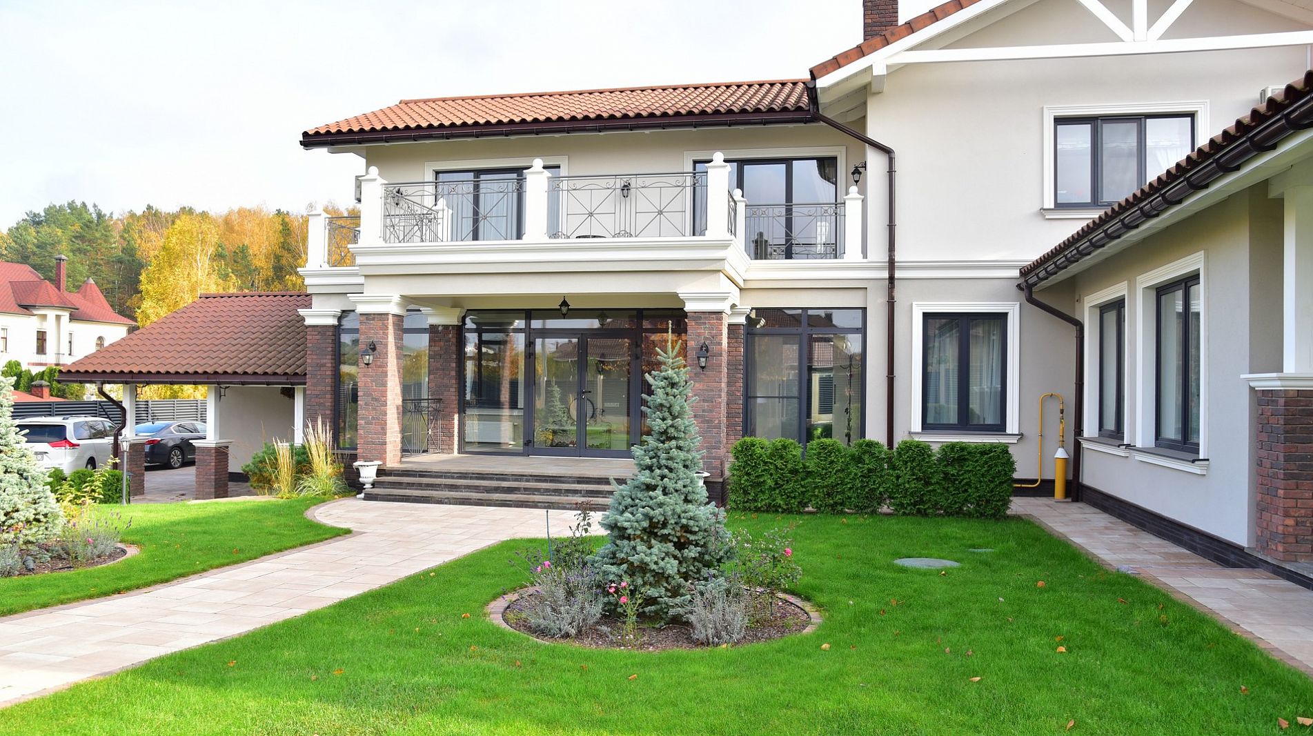 Стильное решение для частного коттеджного домостроения. Порталы могут использоваться для организации выхода на террасу.