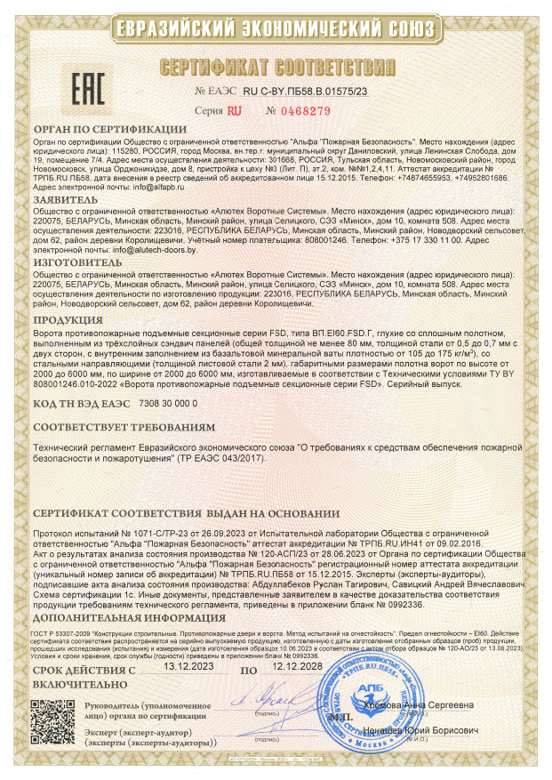 Секционные противопожарные ворота ProFire имеют высокий предел огнестойкости, что подтверждается сертификатом ЕАЭС.