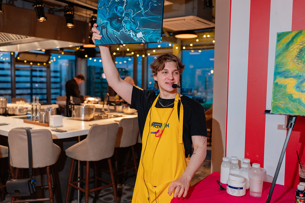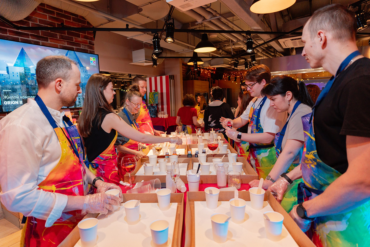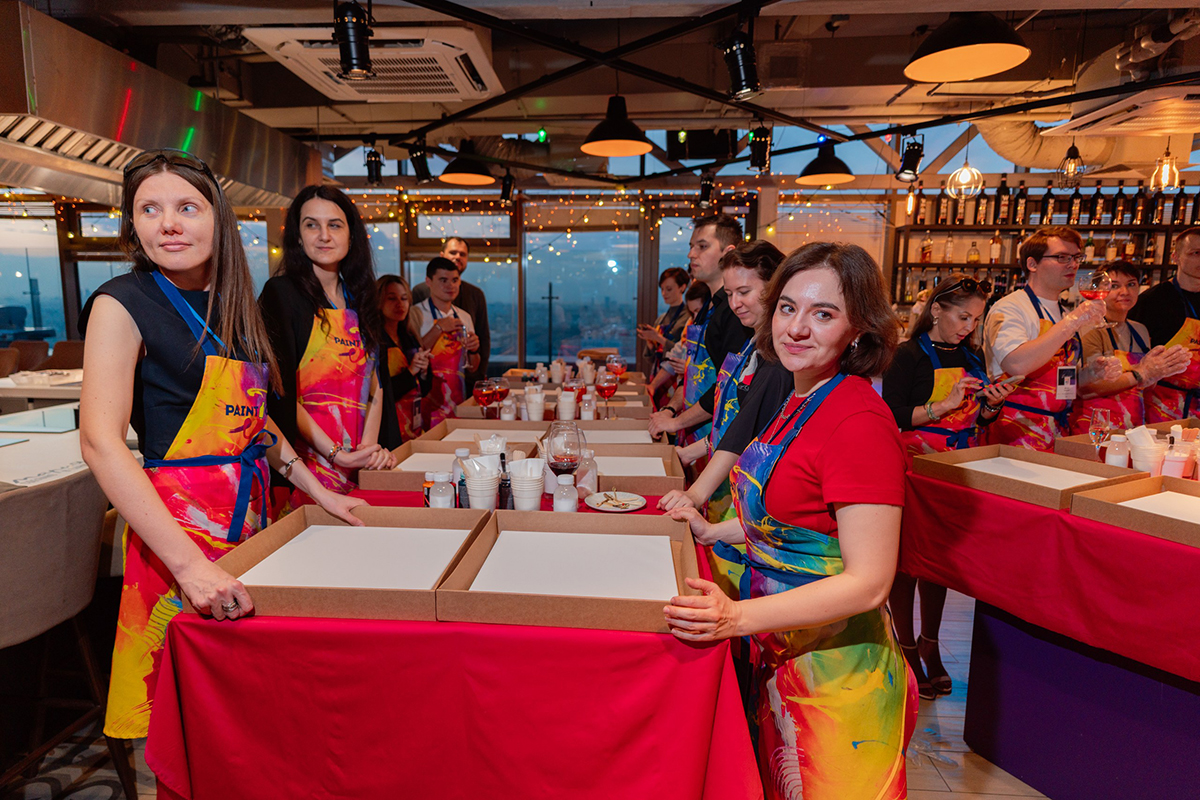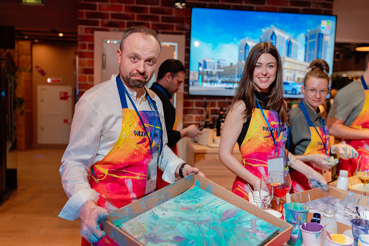 После официальной части участники взялись за творчество. Задачей архитекторов было создать картину в современной технике флюид арт, исходя из вводных от мастера‑инструктора. Новоиспеченные художники активно помогали другу, демонстрируя принцип командной работы, которому следуют и в профессиональной жизни.