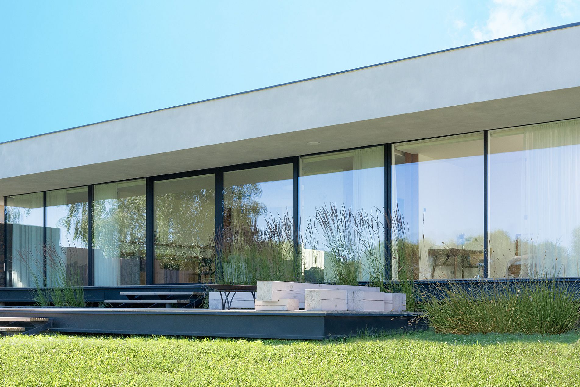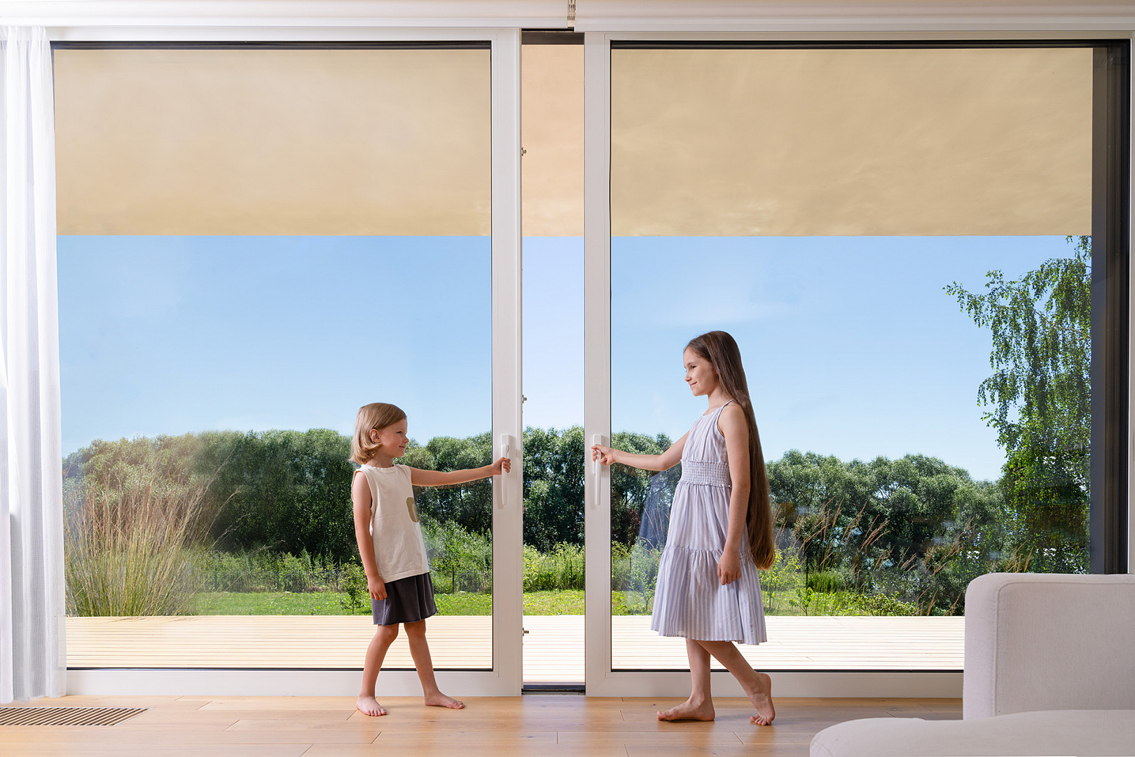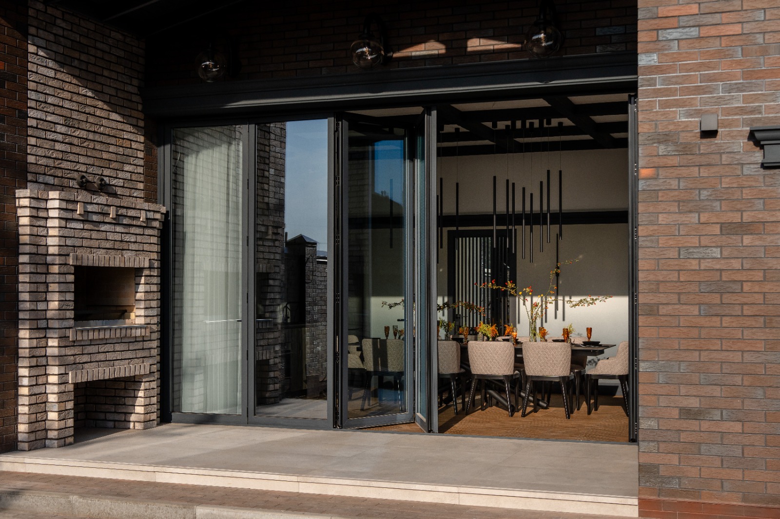 Не занимают пространство помещения и высвобождают большой проем, объединяя между собой две комнаты или комнату с террасой. В закрытом положении обеспечивают непрерывность обзора благодаря меньшему количеству створок.