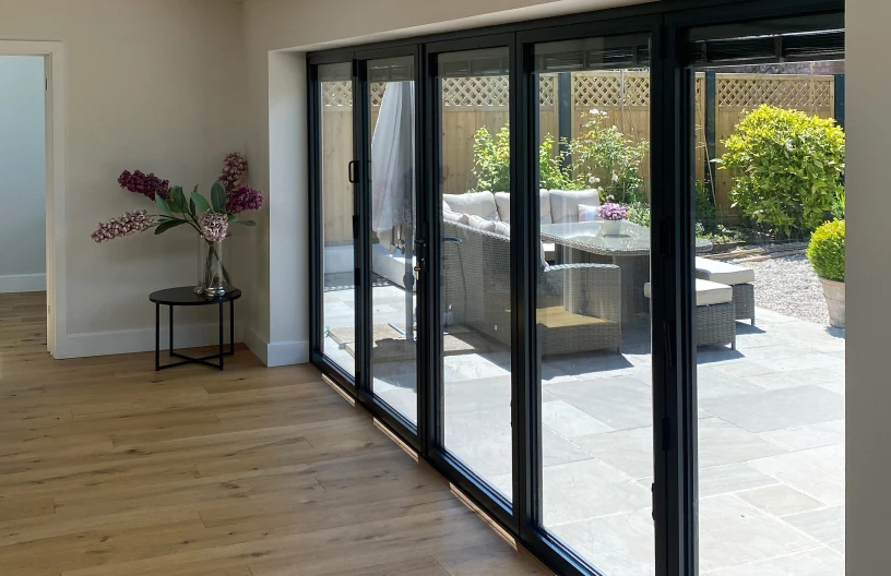 Значимое преимущество складных панорамных дверей — компактность. В сложенном состоянии створки занимают минимум места, высвобождая широкий проем.