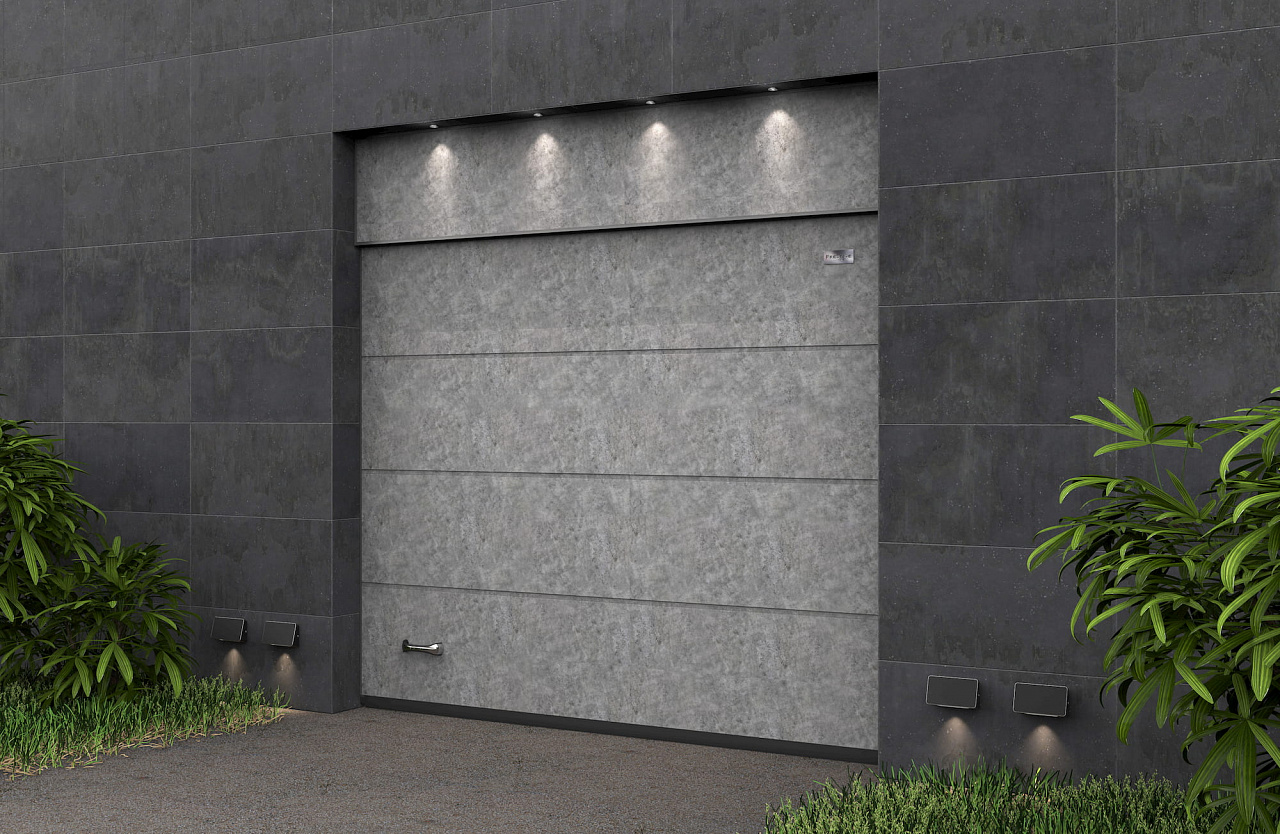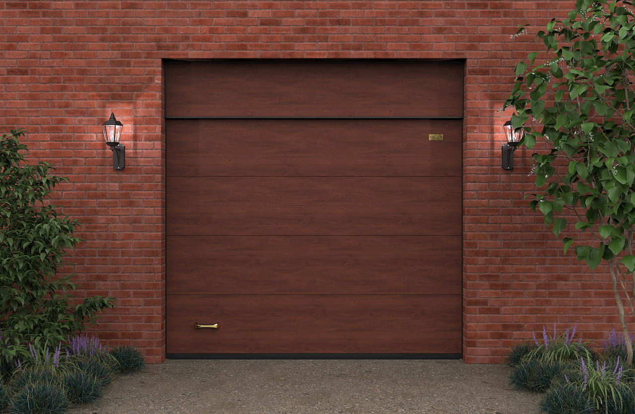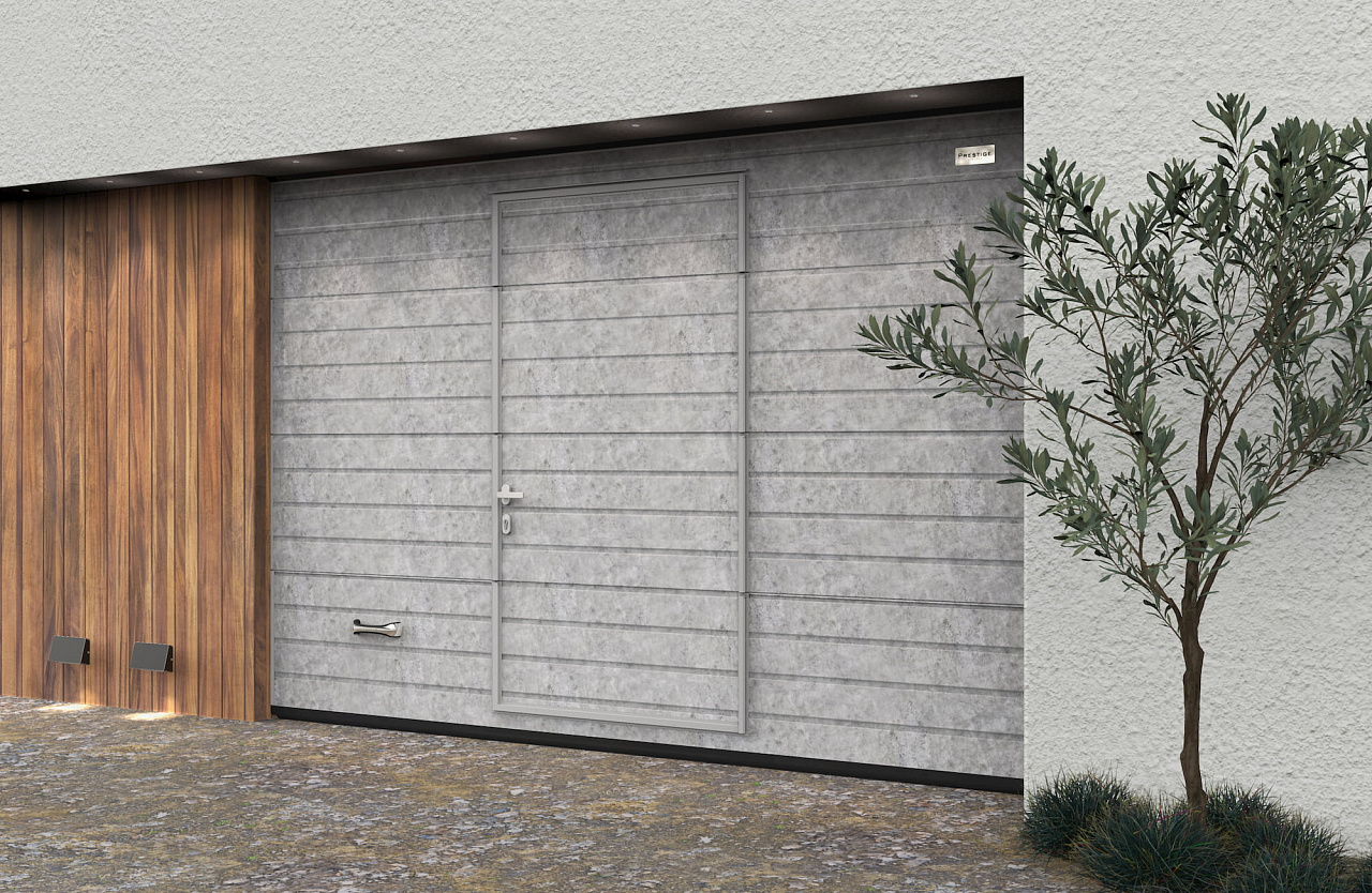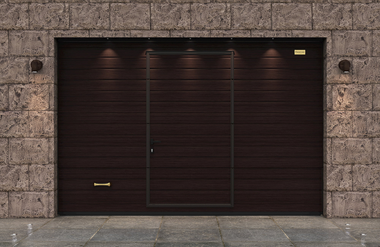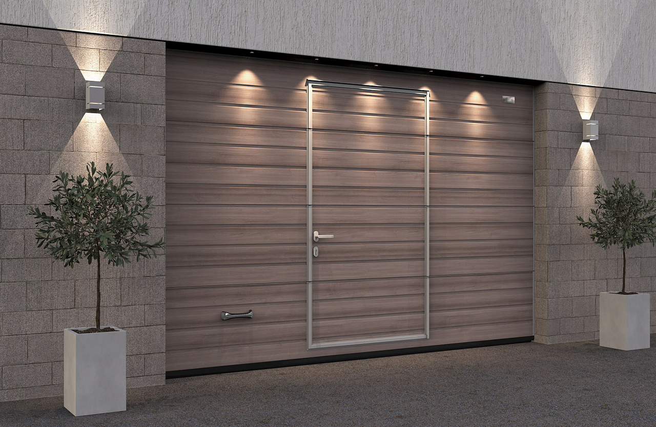 Цифровая печать на секционных воротах со встроенной калиткой и фальшпанелью