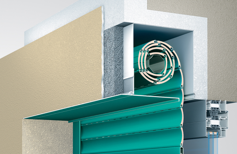 Защитный короб оконных роллет остается незаметным. При работе роллеты создается впечатление, будто полотно опускается из стены.