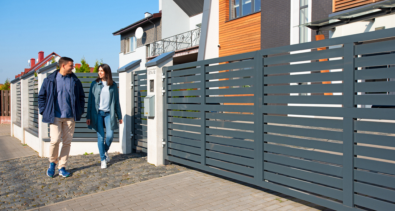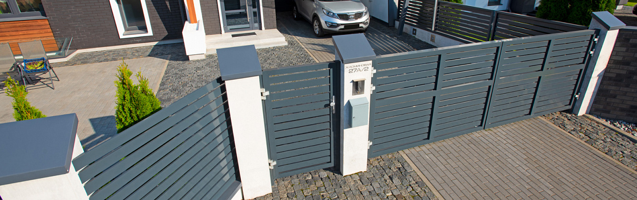 Закажите в одном стиле с воротами также калитку и забор. Изделия с одинаковым заполнением, выполненные в одной цветовой гамме, помогут сохранить гармонию в экстерьере, придадут участку законченный вид.