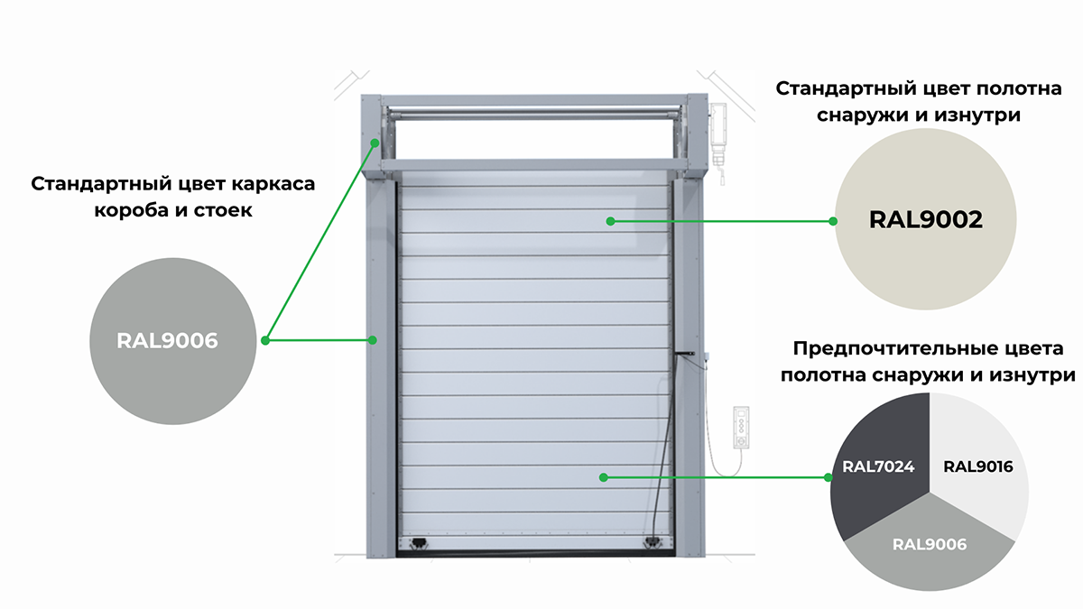 * Полотно ворот снаружи и изнутри, а также каркас короба с вертикальными стойками можно окрасить в другие цвета по каталогу RAL. Предпочтительные цвета полотна — перечень цветов, которые доступны для заказа с минимальной наценкой для клиента.