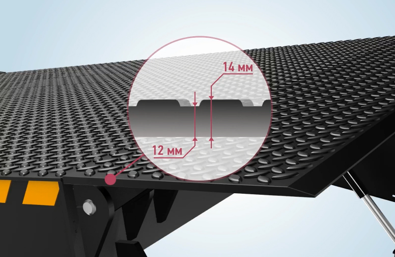 Подъемная часть платформы выполнена из стали с чечевичным рифлением. Это улучшает сцепление колес погрузчика с поверхностью и минимизирует риск непреднамеренного отката, скольжения и падения груза.