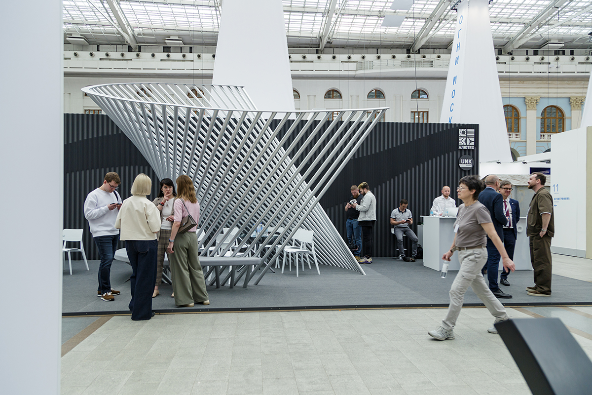 Группа компаний «АЛЮТЕХ», как постоянный участник данного мероприятия, в этом году удивила аудиторию фирменным стендом с арт‑объектом уникальной формы. Работа была спроектирована архитектурным бюро UNK, а изготовлена специалистами флагманского предприятия холдинга, завода «АлюминТехно». Конструкция представляет собой плоскую спираль, построенную по принципу золотого сечения и выполненную из круглого алюминиевого профиля.