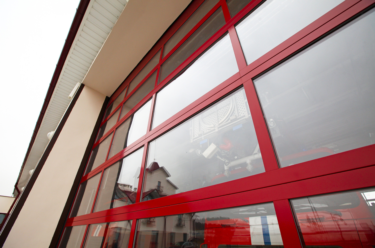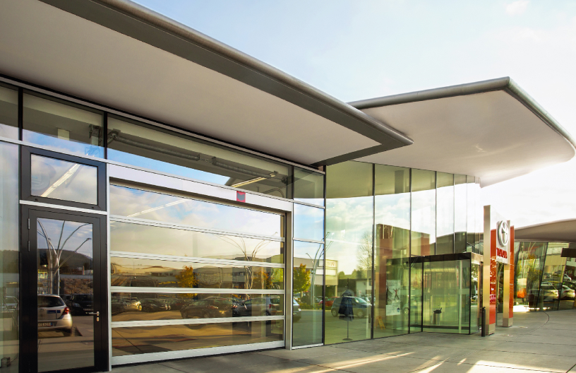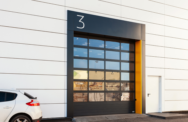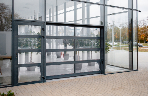 Такие ворота идеально вписываются в архитектуру современных зданий и сочетаются со структурными, цельностеклянными фасадами.