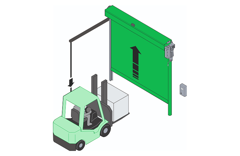 Если после столкновения с грузом или транспортом полотно выйдет из направляющих, то при следующем рабочем цикле оно автоматически вернется в первоначальное положение.