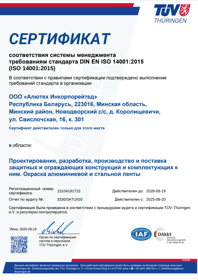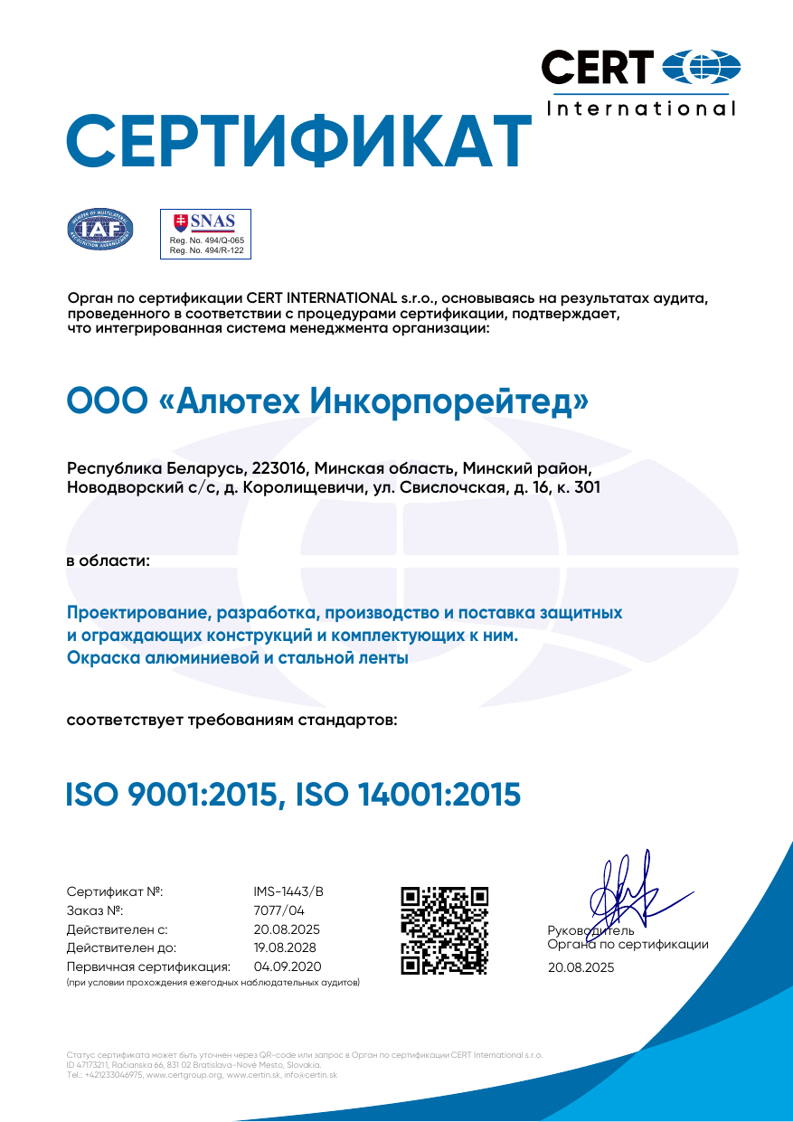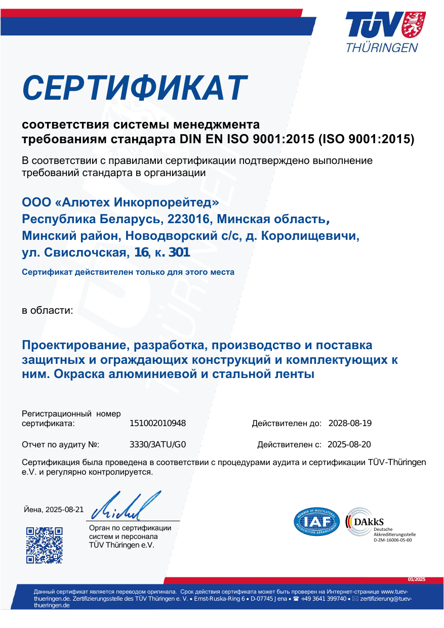 Для подтверждения высокого качества изделий «АЛЮТЕХ» холдинг регулярно проходит испытания в аккредитованных международных лабораториях и ведущих научно-исследовательских центрах стран СНГ, Европы и США.